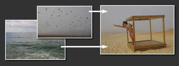 "Estica-te e Alcança os Teus Sonhos". Num dia de verão com nevoeiro, em Agosto passado, tirei esta foto na praia onde umas estruturas de madeira, supostamente para servir como camas de praia num dia solarengo, estavam na areia, dispostos em linha e sem qualquer vigilãncia. O bando de gaivotas foi captado no mesmo dia, algum minutos mais tarde e a foto do mar foi tirada em Outubro. Decidi brincar com estas imagens e este foi o resultado. Um ambiente etéreo encerrando o conceito "Estica-te e Alcança os Teus Sonhos".
